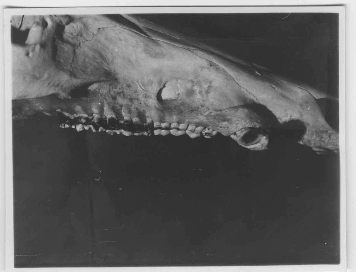 'Kariesangripna tänder av vildsvin. Enligt bildtext: Bortersta molaren karierad. Från sidan. :: :: Se fotonr. 3755-3757.'