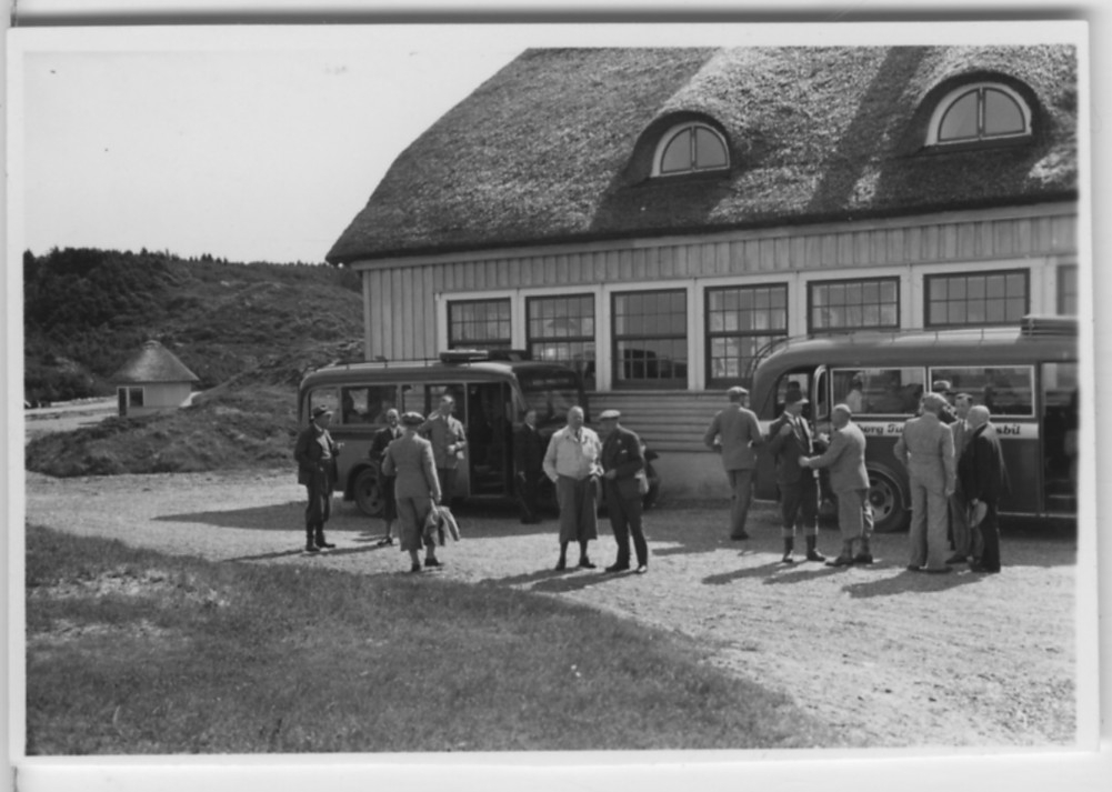'Biologiska föreningens utfärd till Nordjylland: :: :: Svinklöv, gruppen utanför bussarna som står framför Svinklöv Bad Hotell. :: :: Ingår i serie med fotonr. 3824-3859, se även fotonr. 3839-3847 från samma utflykt. Se särskilt fotonr 3846.'