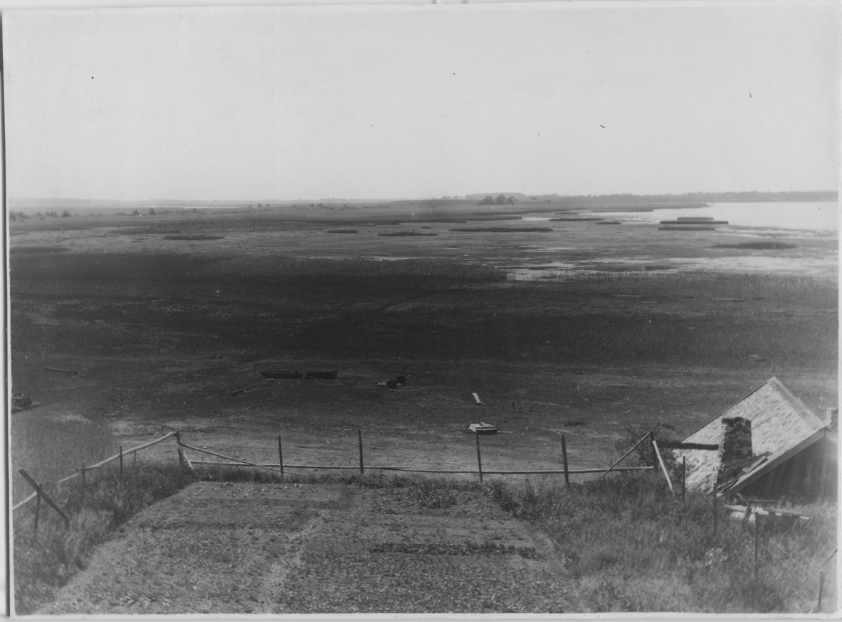 'Bilder från Hornborgasjön från: R. Söderberg: '' Hornborgasjön och dess fornsjöområde'' Del I 1932. :: :: Vy över Hornborgaviken efter sänkningen, med gärdsgård och hus i förgrunden, trähägnad, staket. Eka, trätunna. Vassruggar synliga. Sjösänkning. :: :: Ingår i serie med fotonr. 4245:1-35.'