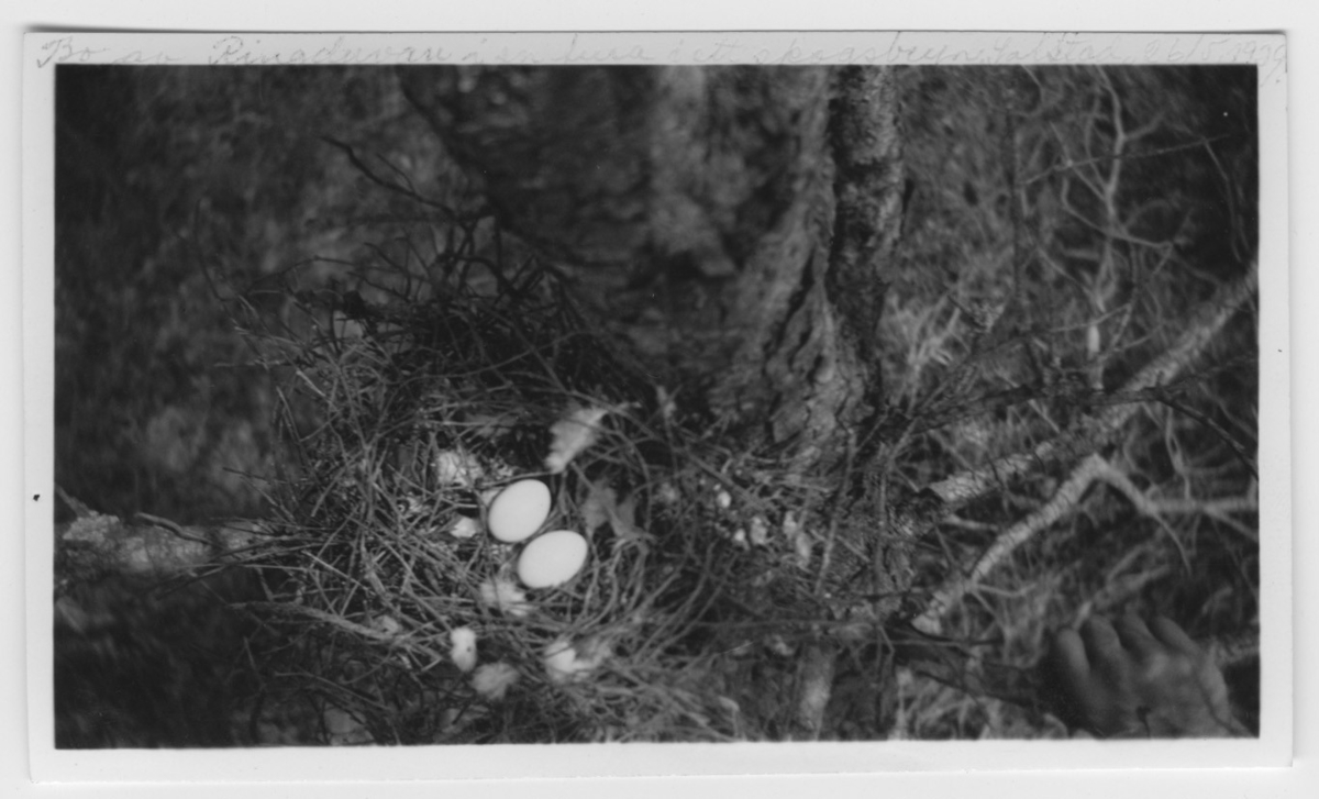 'Ringduva, bo med 2 ägg, i tall. Text på fotot: ''Bo av ringdruvan i en fura i ett skogsbryn.'' :: :: Ingår i serie med fotonr. 4140-4158.'