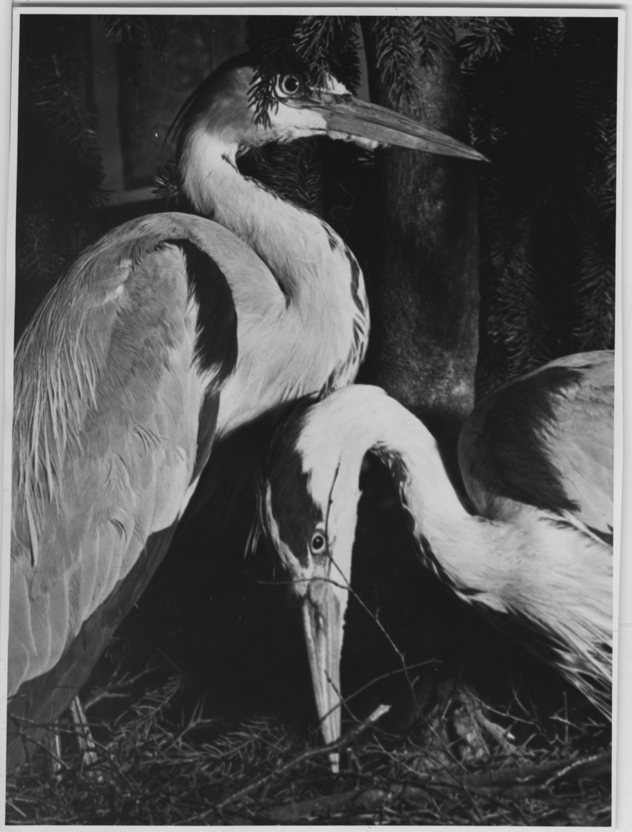 'Del av biologisk grupp med 2 hägrar, hane och hona, på boet med ägg. Monterade i gran. Boet från Trolleholm, Skåne. Fåglarna från Snogeholm, Skåne. :: :: Gen.kat.nr. 1913-2341 och 1913-2342. Av.su. 3923 och 3924. :: :: Gruppen utställd i monterskåp nr. 210 i fågelgången på Göteborgs Naturhistoriska Museum (2007-11-01).'