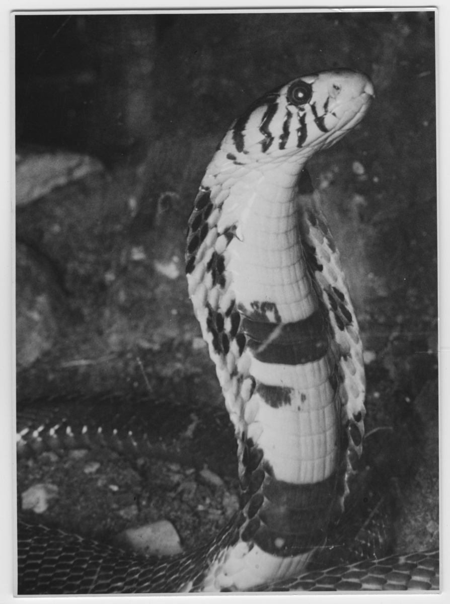 '1 st glasögonorm, från Liberia, med rest huvud, huvudbild. :: :: Ingår i serie med fotonr. 4501:1-60 ur ingenjör Otto Cyréns ''Ormar i fantasi och verklighet''. Bilden med på s. 207 i verket.'