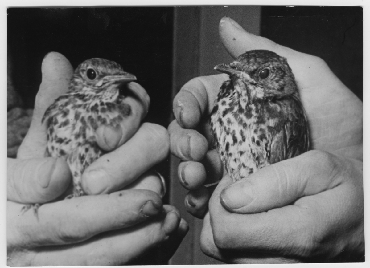 '2 st bastardungar av björktrast och koltrast, hållna av 2 människohänder. :: :: Ingår i serie med fotonr. 4652:1-7. Se även fotonr. 4696.'