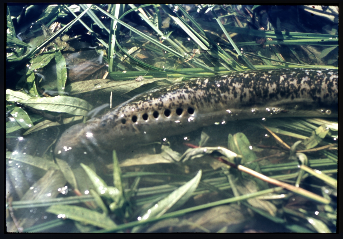 'Havsnejonöga liggande på land, på gräs. Närbild. :: :: Ingår i serie med fotonr. 4653-4657, 4659-4672.'
