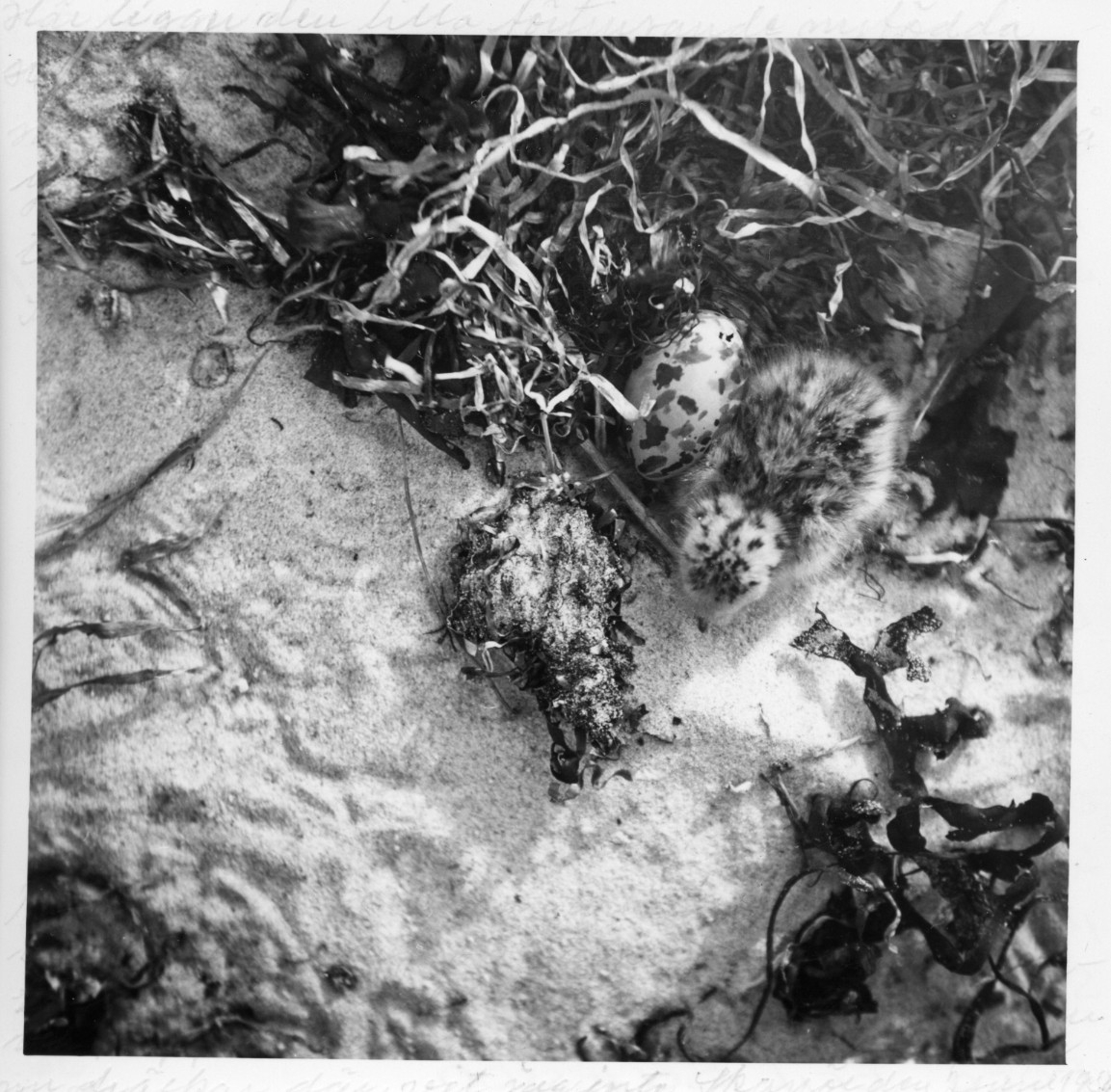 'Enligt anteckning på fotografiets baksida: :: ''Här ligger den lilla förtjusande silvertärnungen invid det kläckfärdiga sandgula ägget med stora svart och grå ytfläckar. Direkt på sanden med torr tång upptill. På en strandrevel vid skanör. :: Bilden togs på 33 cm avstånd. Den 3 juni 1945 fan jag på samma lokal silvertärnans bo med 2 ägg. Om det är mamman och pappan eller dottern och sonen, som nu häckar där, vet jag inte.'' :: :: Ingår i en serie med fotonr. 4512:1-57 med diverse foton av fågelbon med ägg och ungar. Varje fotografi har utförliga anteckningar på sin baksida, kopierade från framsidan, spår av de på framsidan är fortfarande synliga.'