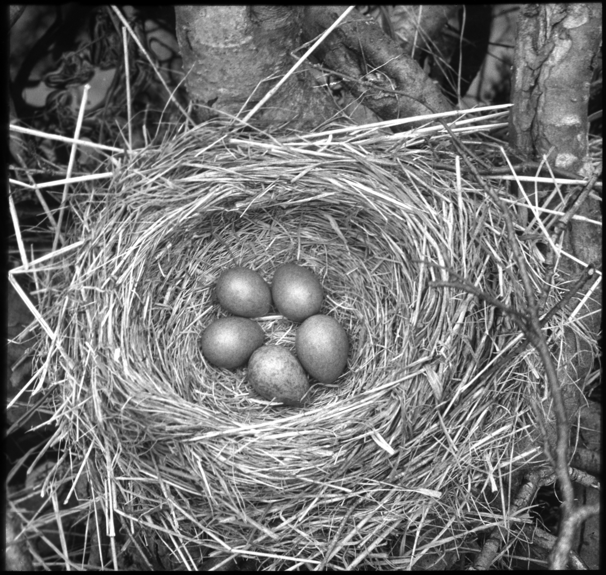 'Bildtext: ''Bo av björktrast.'' Närbild på bo av björktrast med 5 fläckiga ägg. :: :: Ingår i serie med fotonr. 5159:1-9 numrerade med bildnr 139-147. Se även hela fotoserien med fotonr. 5155-5174.'