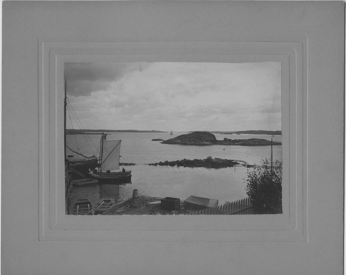 'Kristinebergs Zoologiska station. :: :: Vy ut mot Gullmarsfjorden och bryggan, med staket i förgrunden, klippor och mindre båt med 1 person sittandes i den, dessutom 2 ekor. Trälådor i förgrunden. I fonden segelbåt. :: :: Ingår i serie med fotonr. 5103:1-24.'