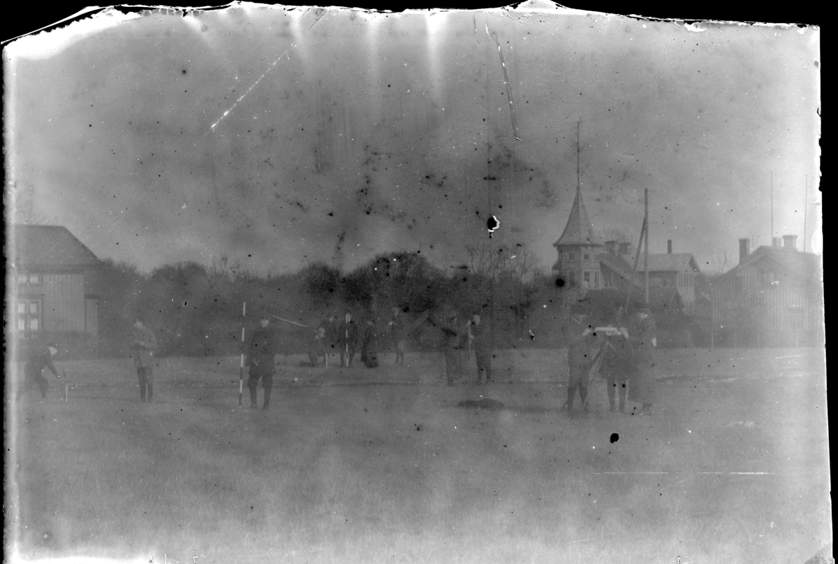 'Ca 14 barn, ungdomar på en grusplan framför trähus. De håller upp randiga stavar och använder ev. någon form av mätutrustning. I bakgrunden byggnad med tornbyggnad. Se även fotonr. 5140:5. :: :: Ingår i serie med fotonr. 5140:1-39.'