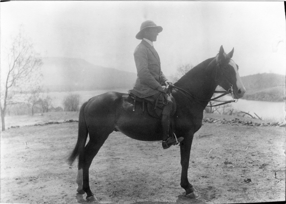'Diverse fotografier från bl.a. dåvarande Nordrhodesia, nu Zambia, tagna av Konsul Magnus Leijer. :: :: En man på en häst, fotograferad från sidan. I bakgrunden är vatten och berg synligt.'