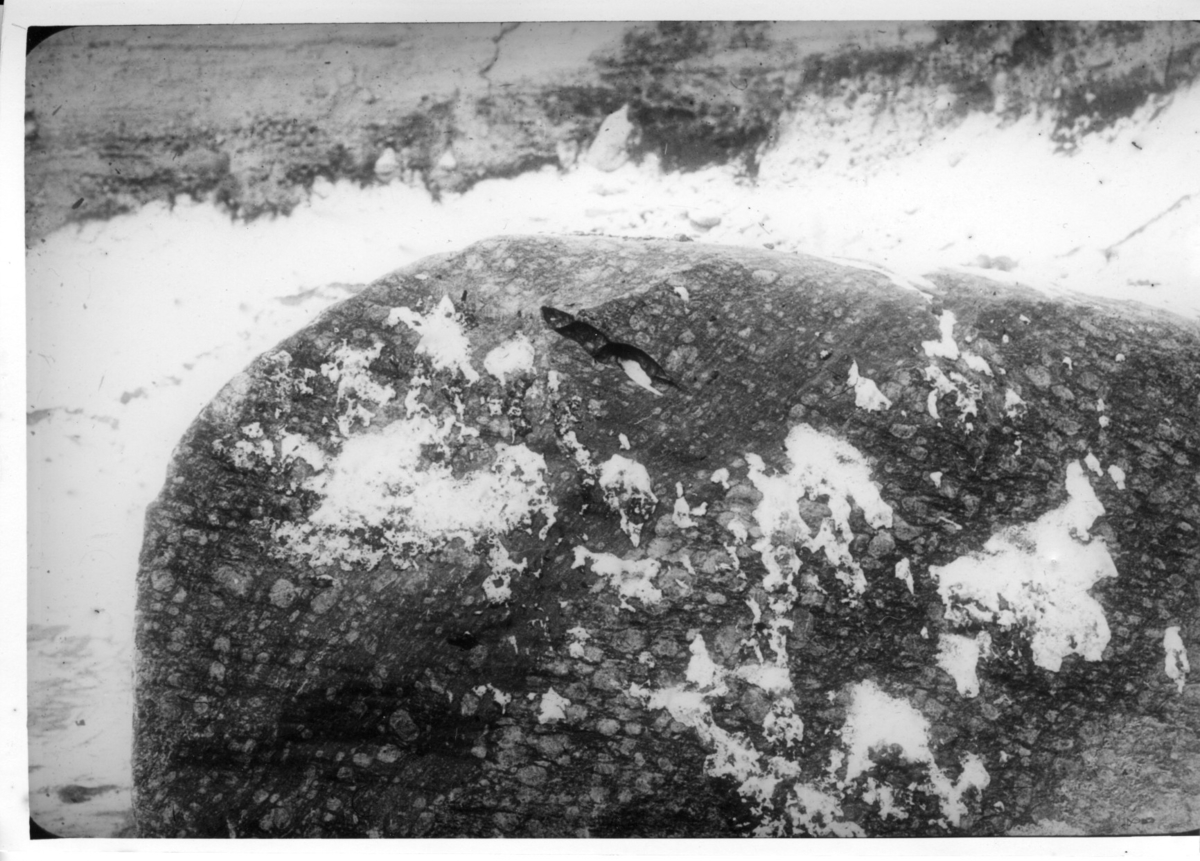 'Geologi :: Flytt av ett stort vindslipat stenblock av ögongnejs från Ellesbo grustag till Göteborgs Naturhistoriska museum. Blocket väger ca 30 ton. :: :: Närbild på den s.k. alveolen, en slingrande fördjupning i stenen. Stenblocket delvis snötäckt.'