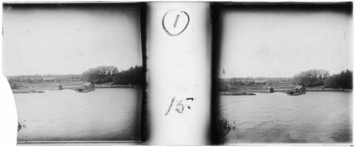 'Bildtext: ''View from opposite land.'' (Vy från andra sidan) :: Vy över vatten in mot land med hus och en trästuga, lada ev. båthus ute i vattnet. Flaggstång. :: :: Ingår i serie med fotonr. 5251:1-21, se även hela serien med fotonr. 5237-5267.'