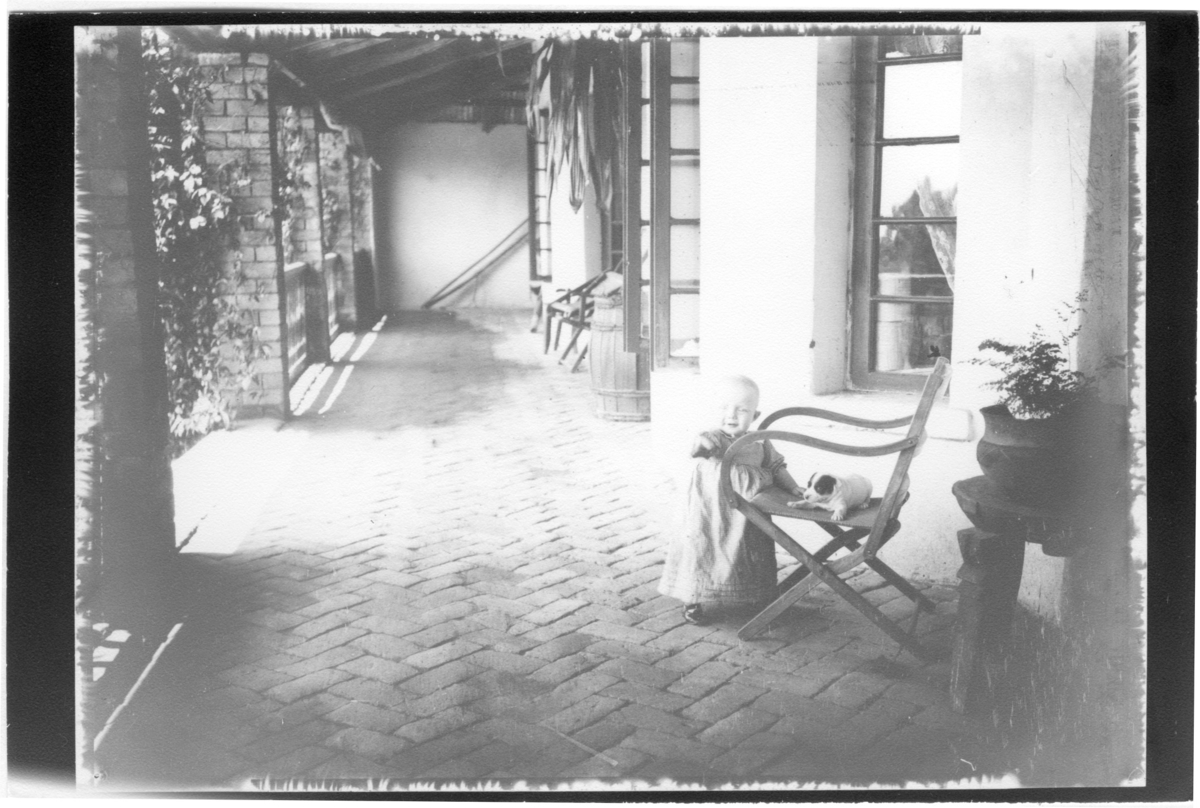 'Diverse fotografier från bl.a. dåvarande Nordrhodesia, nu Zambia, tagna av Konsul Magnus Leijer. :: :: Ett barn stående vid en stol med en hundvalp på sitsen. Placerade på en stenlagd veranda.'