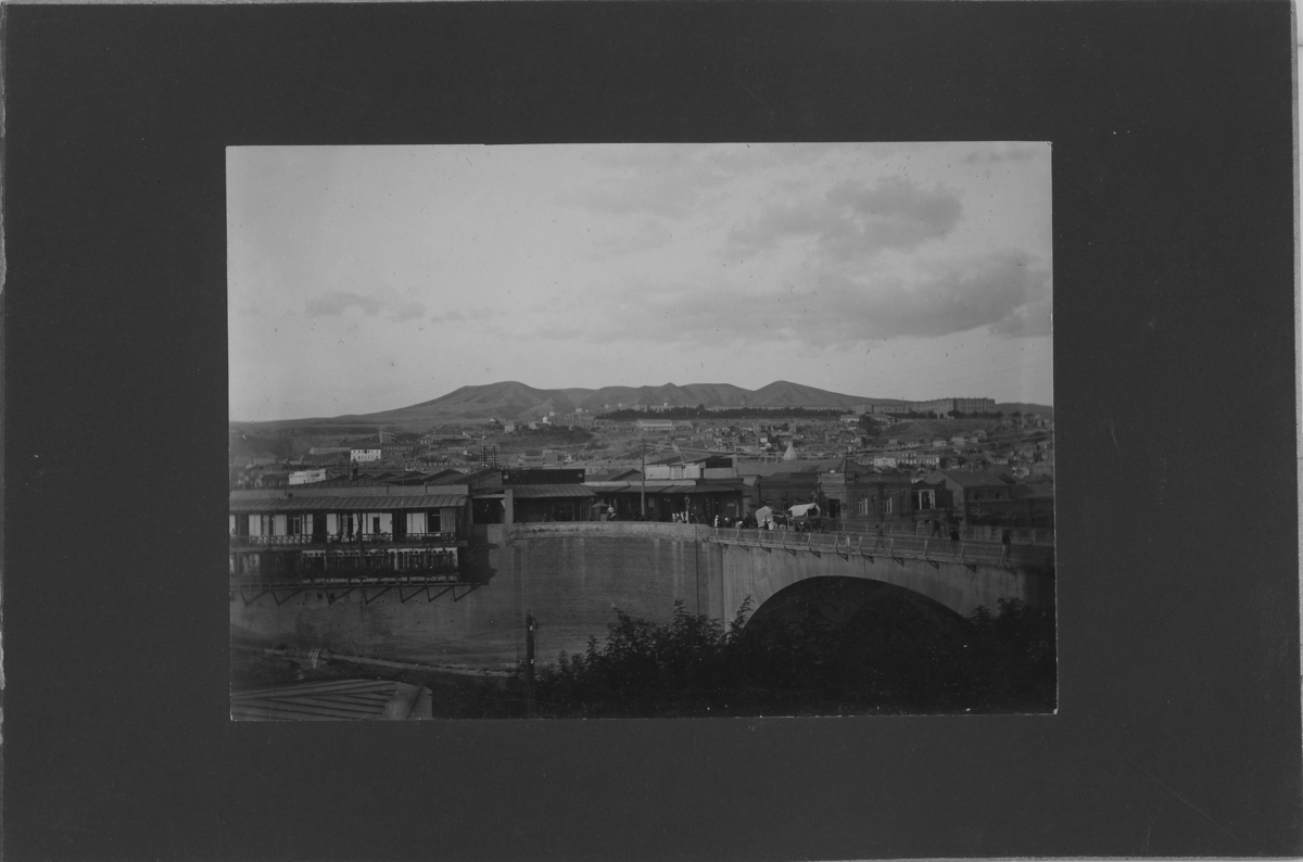 'Vy över stad. I bakgrunden en mjuk bergskedja. I förgrunden en bro / viadukt med väg på. I förgrunden hus med balkonger. Människor. Hus. Häst och vagn. Elldening. Detta motiv är samma plats som fotonr. 5272:6. :: :: Bilden är lik fotonr 5272 6b. :: :: Ingår i serie med fotonr. 5288:1-30. Se även fotonr. 5269-5292 med bilder från Stuxbergs resa till Kaukasien.'