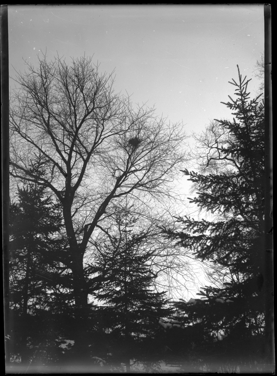 'Vy upp mot trädkrona med fågelbo. Även barrträd, gran. :: :: Ingår i serie med fotonr. 5281:1-13. Se även fotonr. 5269-5292 med bilder från Stuxbergs resa till Kaukasien.'