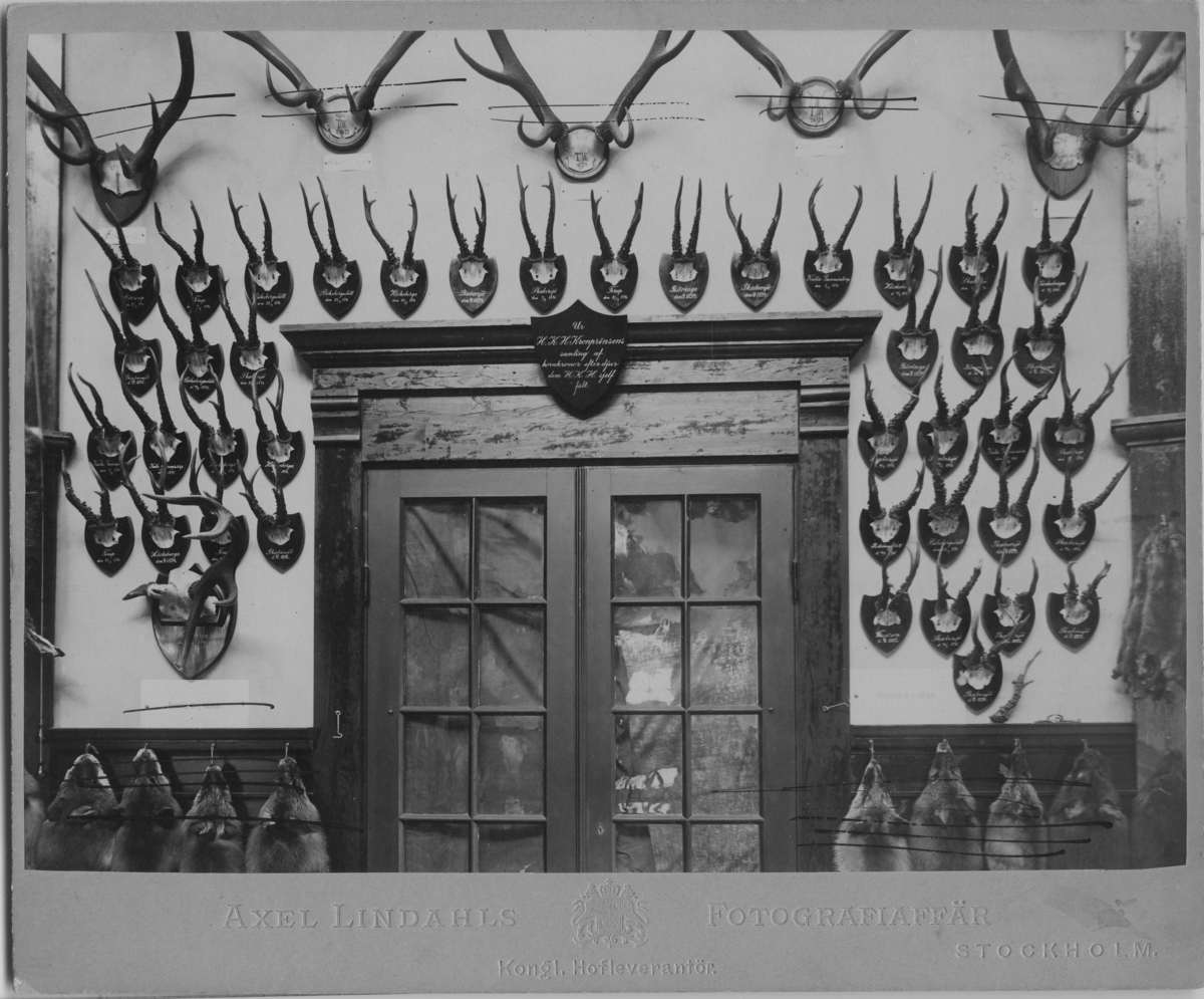'Diverse foton på horn och gevär från jaktutställningar. :: :: Ett flertal monterade horn hängandes kring en dubbeldörr, satmett flertal skinn. Mitt över dörren hänger en sköld med inskription: ''ur H.K.H. Kronprinsens samling af hornkronor efter djur dem H.K. sjelf fält.'' :: :: Ingår i serie med fotonr. 5599:1-17.'