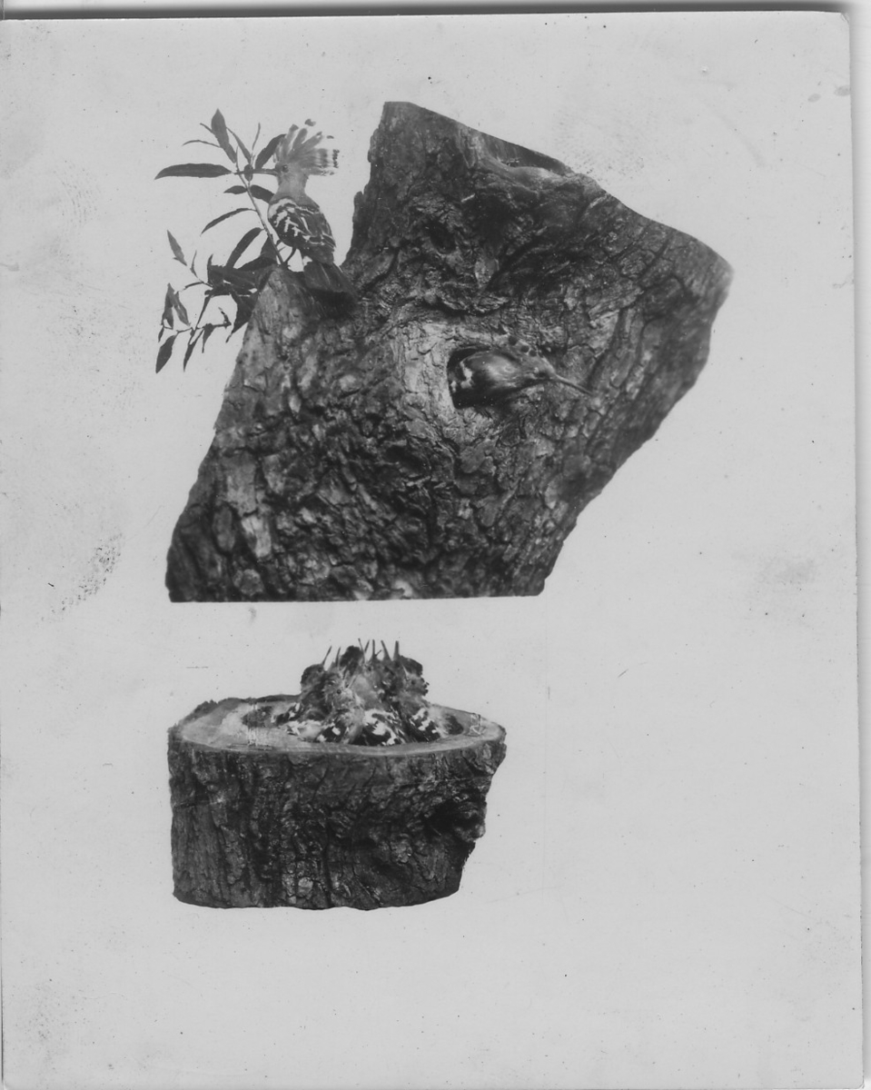 'Div. bilder på ''museala arrangemang av fåglar'', bilderna är insamlade av Leonard Axel Jägerskiöld. :: :: Trästubbe med härfågelungar samt yterligare en med en en vuxen Härfågel sittandes på.'