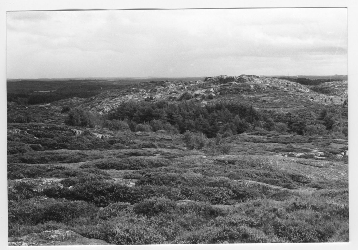 'Bildtext: ''Hällandskap med skog i skrevorna. Riktning 90.'' :: Vy över berghällar med ljungvegetation och viss lövträdsvegetation. Barrträd i skrevorna, sprickorna. :: :: Ingår i serie med fotonr. 6970:1-1125, dokumentation av Hisingens naturgeografi, visande landskapsformerna i stora drag och gjord inför exploateringen av området. Platserna för fotograferingen finns utsatta på karta i skala 1:4000 som finns på Göteborgs Naturhistoriska musem. Fotoriktningen mättes med kompass i gammalgrader.'