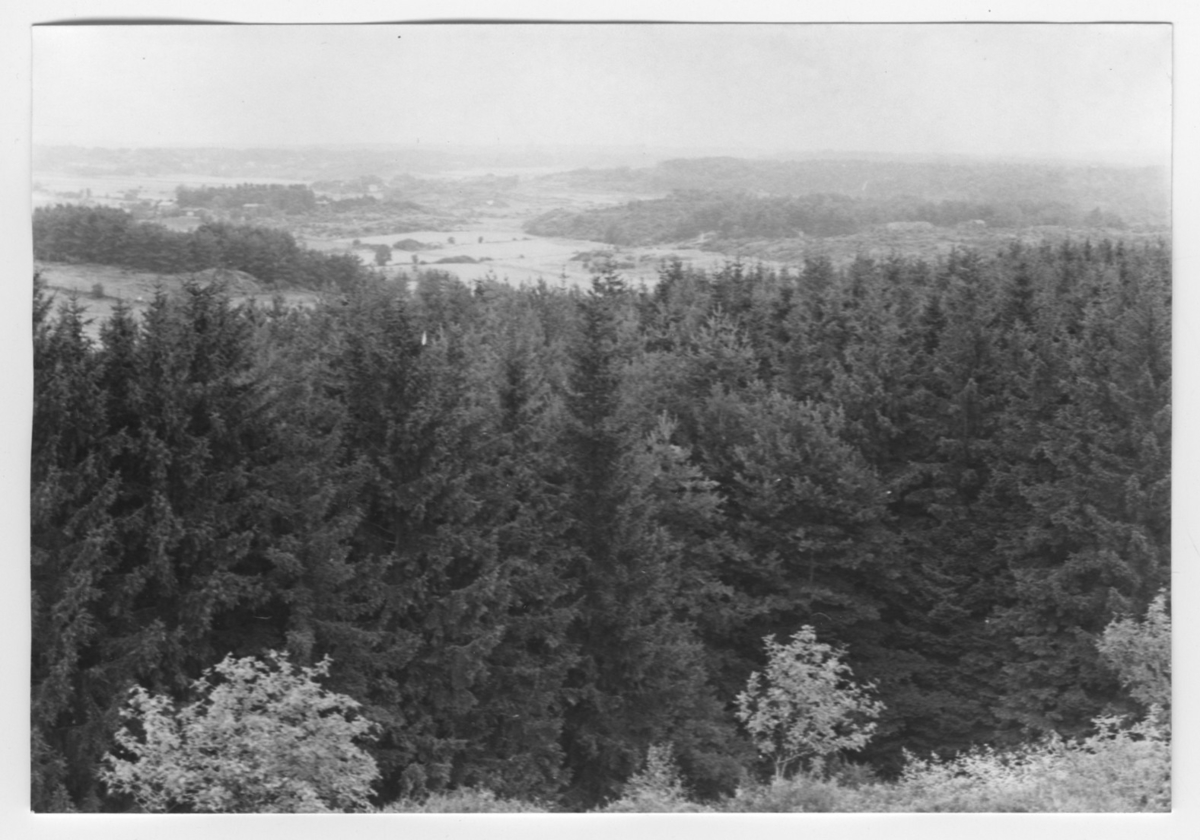 'Bildtext: ''Skogklätt hällandskap. Riktning 48.'' :: Vy med barrträd, gran i förgrunden och på avstånd öppna fält, åkermark. :: :: Ingår i serie med fotonr. 6970:1-1125, dokumentation av Hisingens naturgeografi, visande landskapsformerna i stora drag och gjord inför exploateringen av området. Platserna för fotograferingen finns utsatta på karta i skala 1:4000 som finns på Göteborgs Naturhistoriska musem. Fotoriktningen mättes med kompass i gammalgrader.'