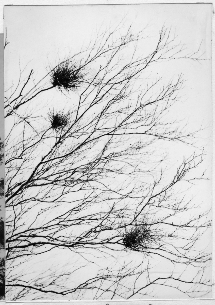 'Bildtext: ''Häxkvastar på björk.'' Närbild på häxkvastbildning i grenverket hos björkträd. :: :: Fotonr. 7047:24-27 indelad under rubriken ''Svampar (Skadliga, giftiga, ätliga).'' Ingår i serie med fotonr. 7046:1-383, 7047:1-33 och 7048:1-67 med bilder från Länsjägmästare John Lindners bildarkiv.'