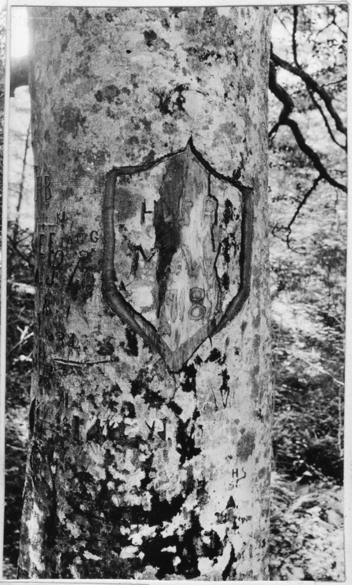 'Bildtext: ''Bokstam med sönderskuren bark.'' Närbild på inristad text och figur på trädstam. :: :: Fotonr. 7048:1-26 indelad under rubriken ''Däggdjur, Människor''. Ingår i serie med fotonr. 7046:1-383, 7047:1-33 och 7048:1-67 med bilder från Länsjägmästare John Lindners bildarkiv.'