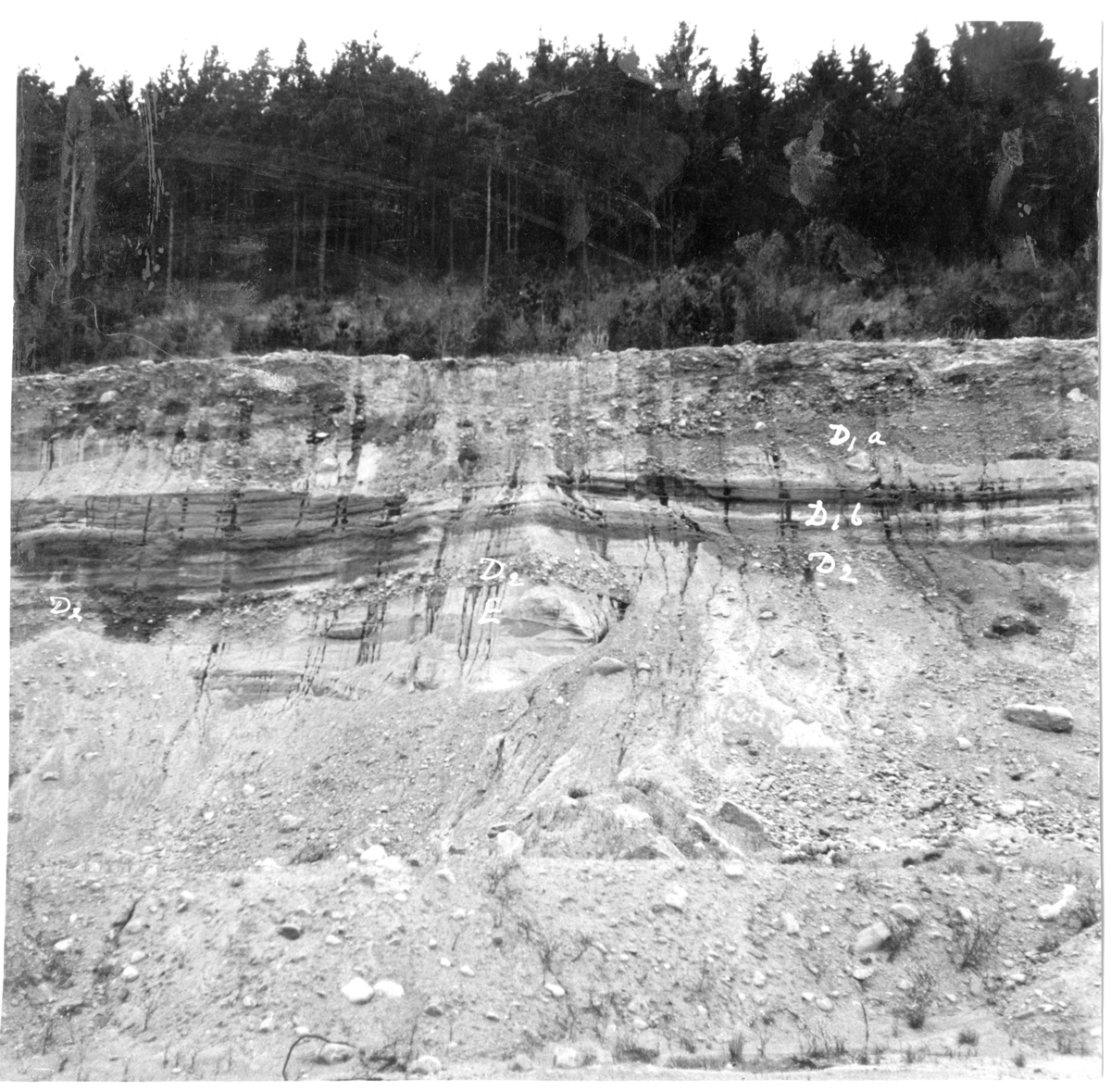 'Bildtext: ''Landsvägsväggen.'' Närbild på grusavlagringens lagerföljd med morän. Lager markerade på bilden. :: :: Ingår i serie med fotonr. 7060:1-20 med bilder från Dösebacka- och/eller Ellesbomoränen.'