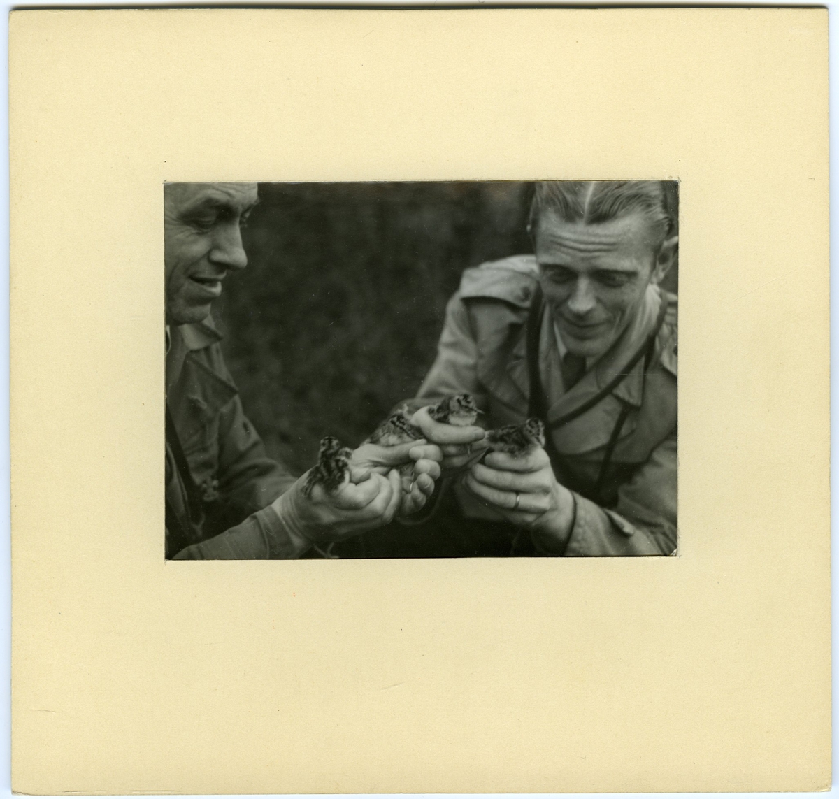 'Bildtext: ''Far och farbror Harald Wedérus med 4 ungar av skogssnäppa (Enlikt S.O.F:s ''Förteckning över Sveriges fåglar'' är arten ej uppgiven häckfågel i Västmanland).'' :: 2 män hållande 4 ungar av skogssnäppa. :: :: Ingår i serie med fotonr. 7083:1-55.'