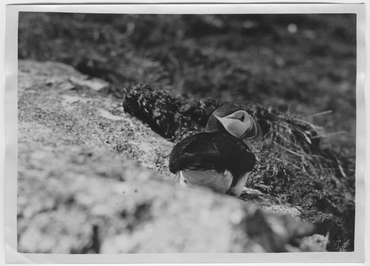 'Lunnefågel sedd snett bakifrån, närbild. :: :: Ingår i serie med fotonr. 2462-2487.'