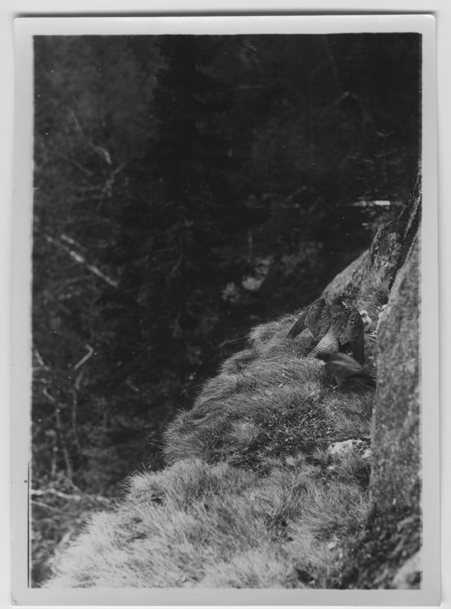'Pilgrimsfalk, hona vid boet. :: :: Text på baksidan av fotot ''När ungarna äro små höll honan ständigt vakt och uppmanade hanen (med jamande läten) att skaffa föda. Så snart han sedan närmade sig med rov flög hon skrikande emot honom och ryckte skickligt i förbifarten med klorna fångsten, som hon bar och förde hem denna. Ibalnd möttes de som två svalor uppe i luften, hanen grep bytet med näbben och gav det åt honan, som tog det i munnen innan klorna åter - på hemvägen - komma till användning. Erhöll hanen intill svar på sitt foodery kom han efter en stund själv med maten till boet, men bortkördes efter tämligen omilt av den insusande falkhonan (På bilden ses han tomhänt draga bort medan den uppretade honan breda ut sig över fångsten, som hon själv vill stycka.'' :: :: Se serie med fotonr. 3151-3200. Se även fotonr. 1771-1837.'
