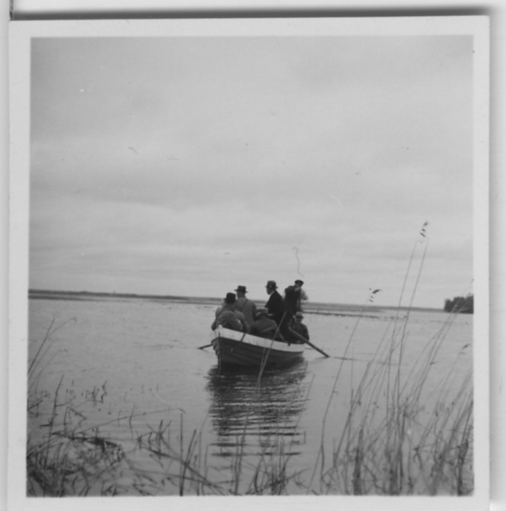 'Biologiska föreningens utfärd till Tåkern, Vadstena m.fl. platser: :: :: Ca 10 män ror i en eka på sjön. :: :: Se fotonr. 3588-3634 samt 3661-3677.'
