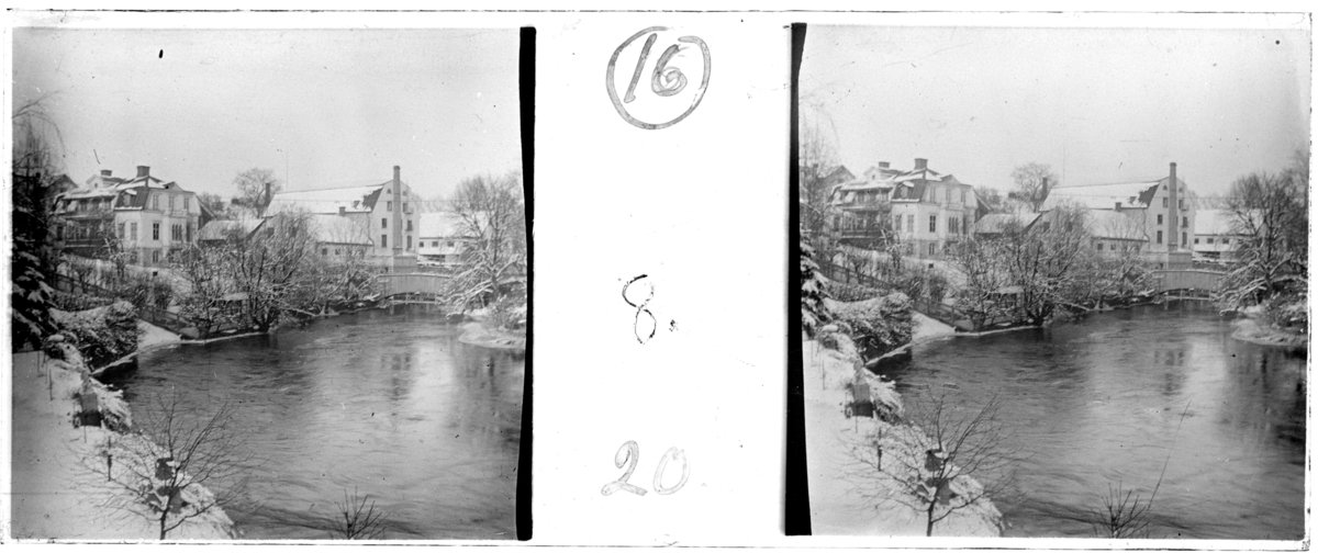 'Bildtext: ''Behmbron, västerifrån.'' :: Vy med Nyköpingsån mot Behmbron, hus, ett med hög skorsten. Snöklädda träd och buskar. Vinterlandskap. :: :: Ingår i serie med fotonr. 5256:1-18, se även hela serien med fotonr. 5237-5267.'
