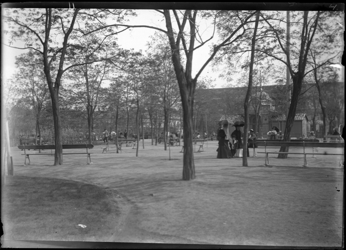 'Vy över park med bänkar och träd. I parken promenerande människor, kvinnor med parasoll, barn, män. I bakgrunden skymtar byggnad. :: :: Ingår i serie med fotonr. 5278:1-21. Se även fotonr. 5269-5292 med bilder från Stuxbergs resa till Kaukasien.'