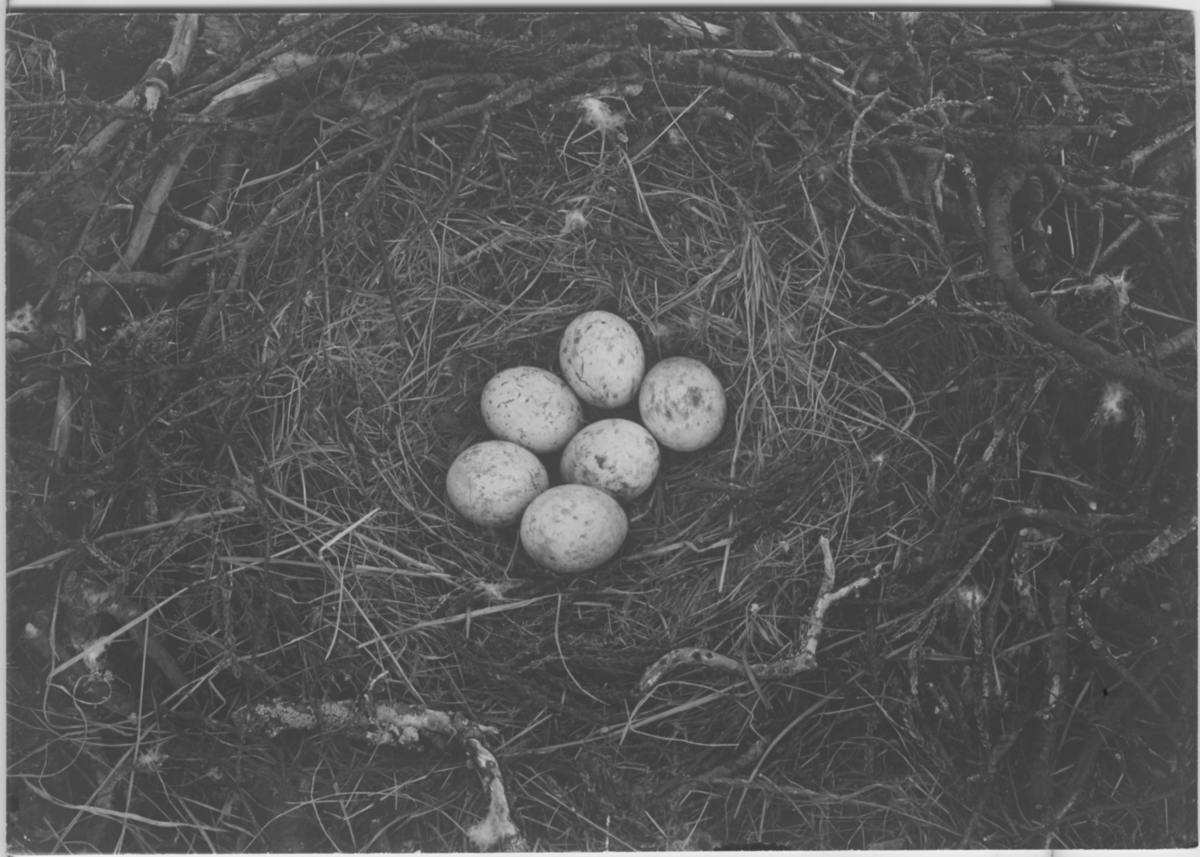 'Bo med 6 st ägg av fjällvråk, närbild. :: :: Se fotonr. 134-135. :: :: Ingår i serie med fotonr. 128-148.'
