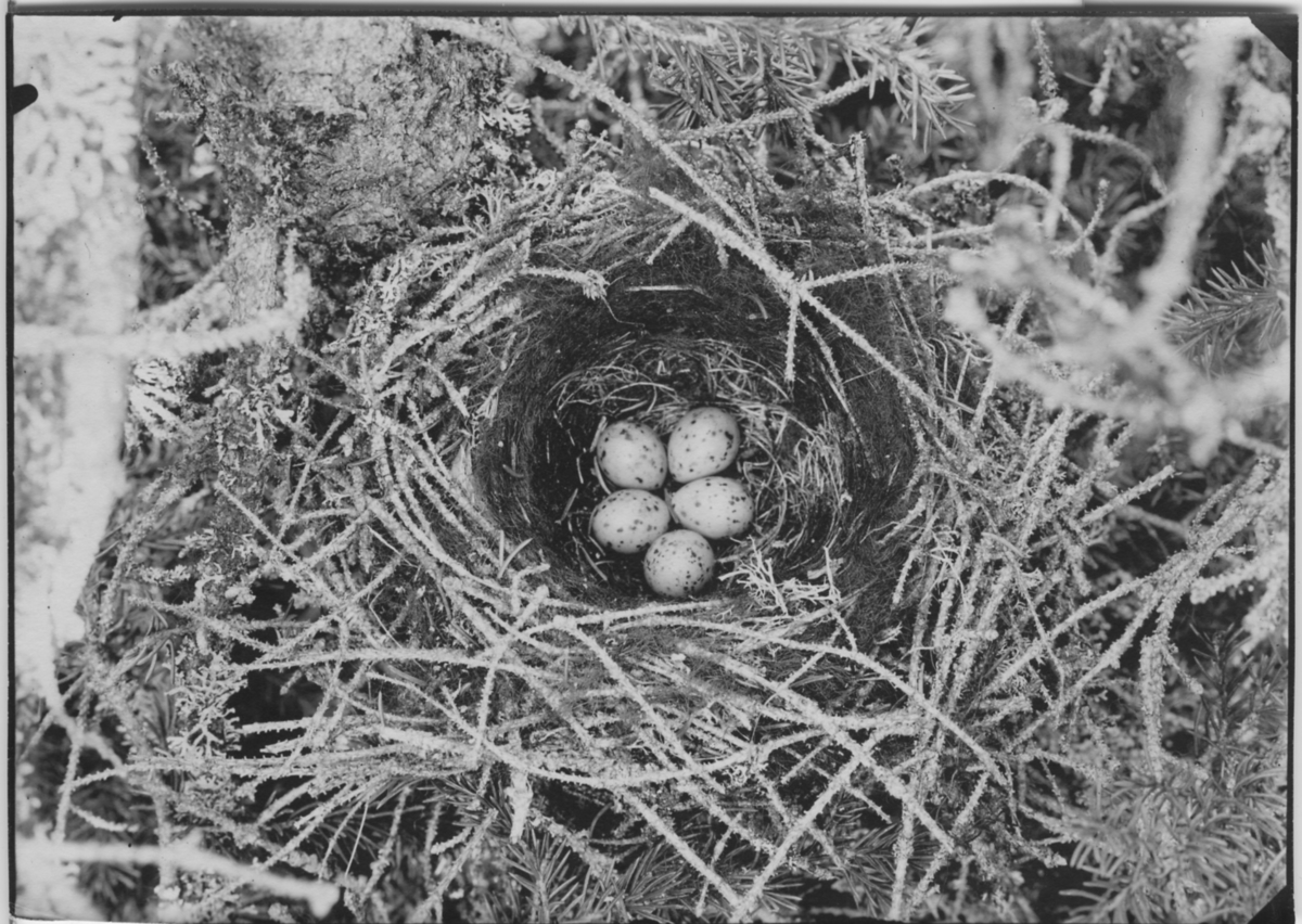 'Bo med 5 st ägg av sidensvans bland grangrenar. :: :: Ingår i serie med fotonr. 156-158.'