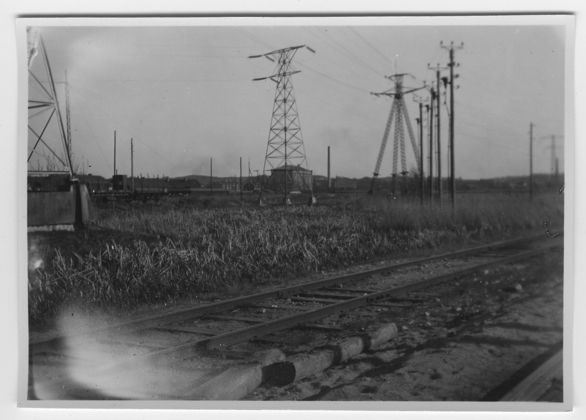 'Häckningsplats för rörhöna. I förgrunden järnvägsspår och elledningsstolpar. I bakgrunden öppna järnvägsvagnar. På avstånd även stor byggnad samt några mindre. Se fotonr. 1322-1324. :: :: Se serie med fotonr. 1305-1356.'