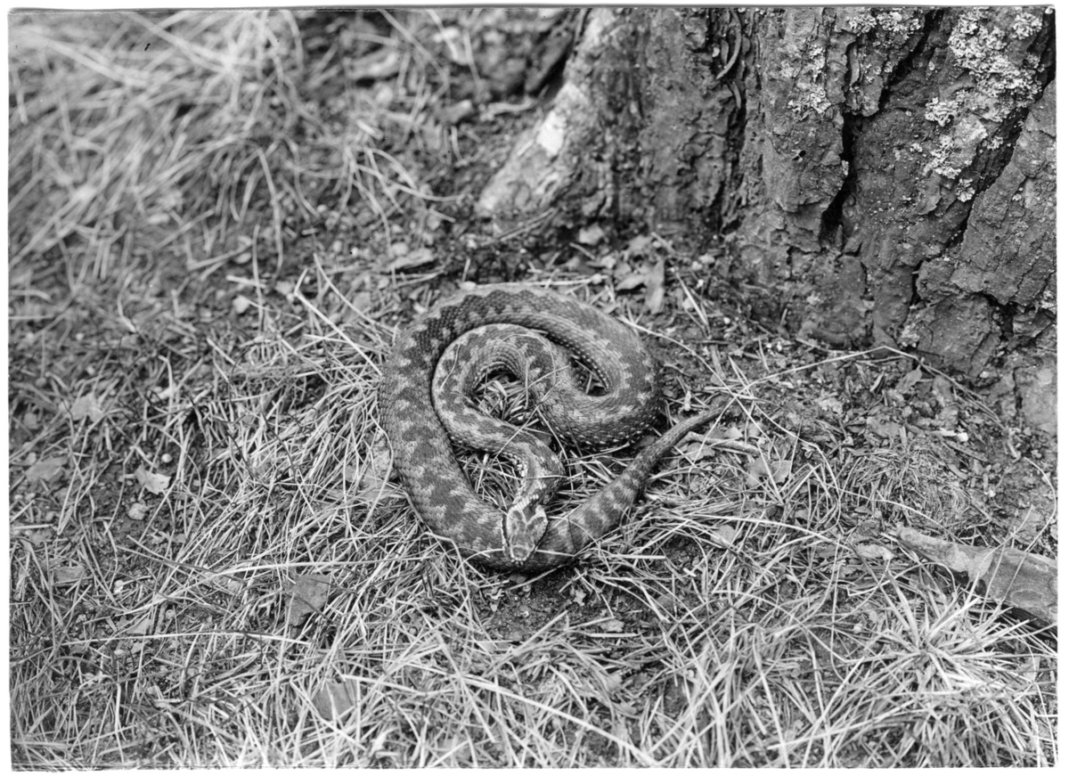 'Huggorm ihopringlad, liggande i gräset. Sedd ovanifrån. :: :: Ingår i serie med fotonr. 1709-1724.'