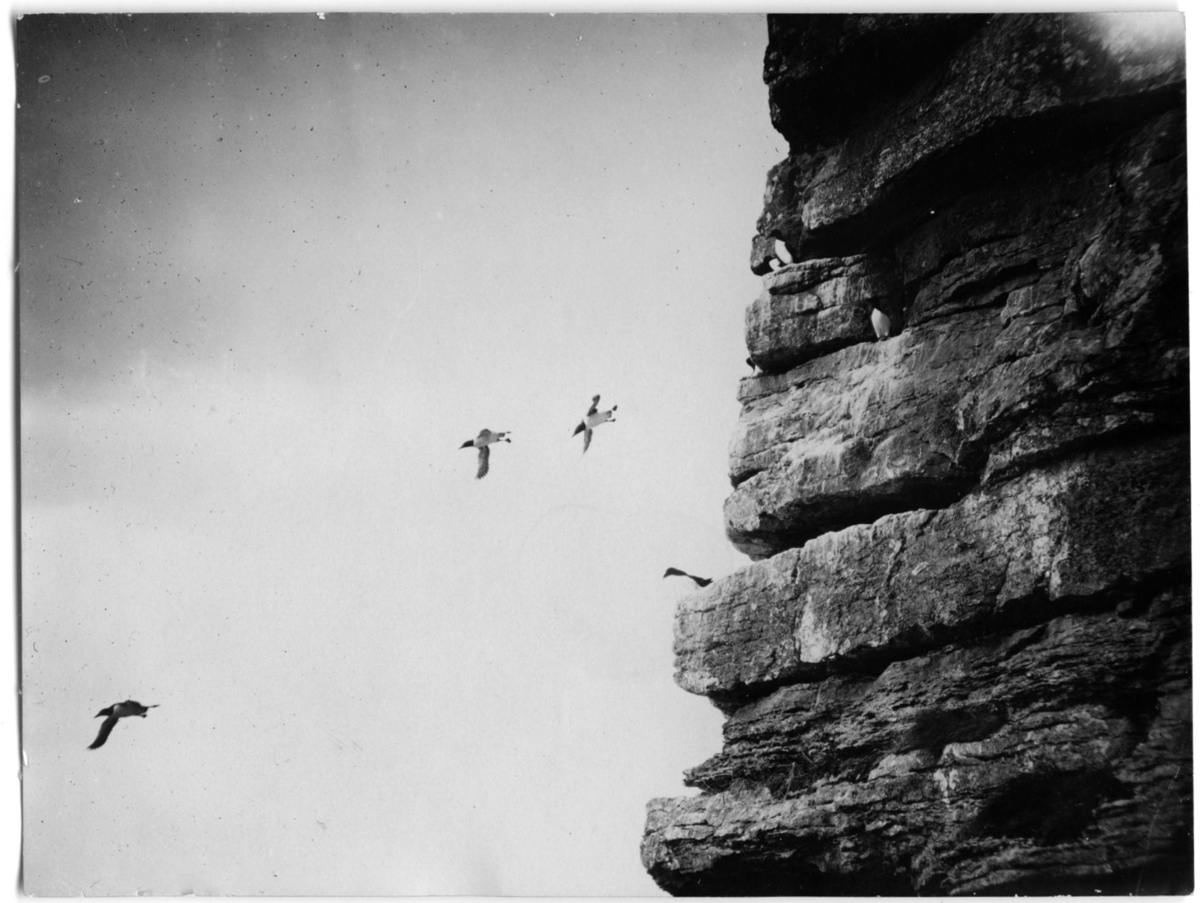 Vy med fågelberg varifrån fåglar flyger ut. Se även fotonr. 1414.