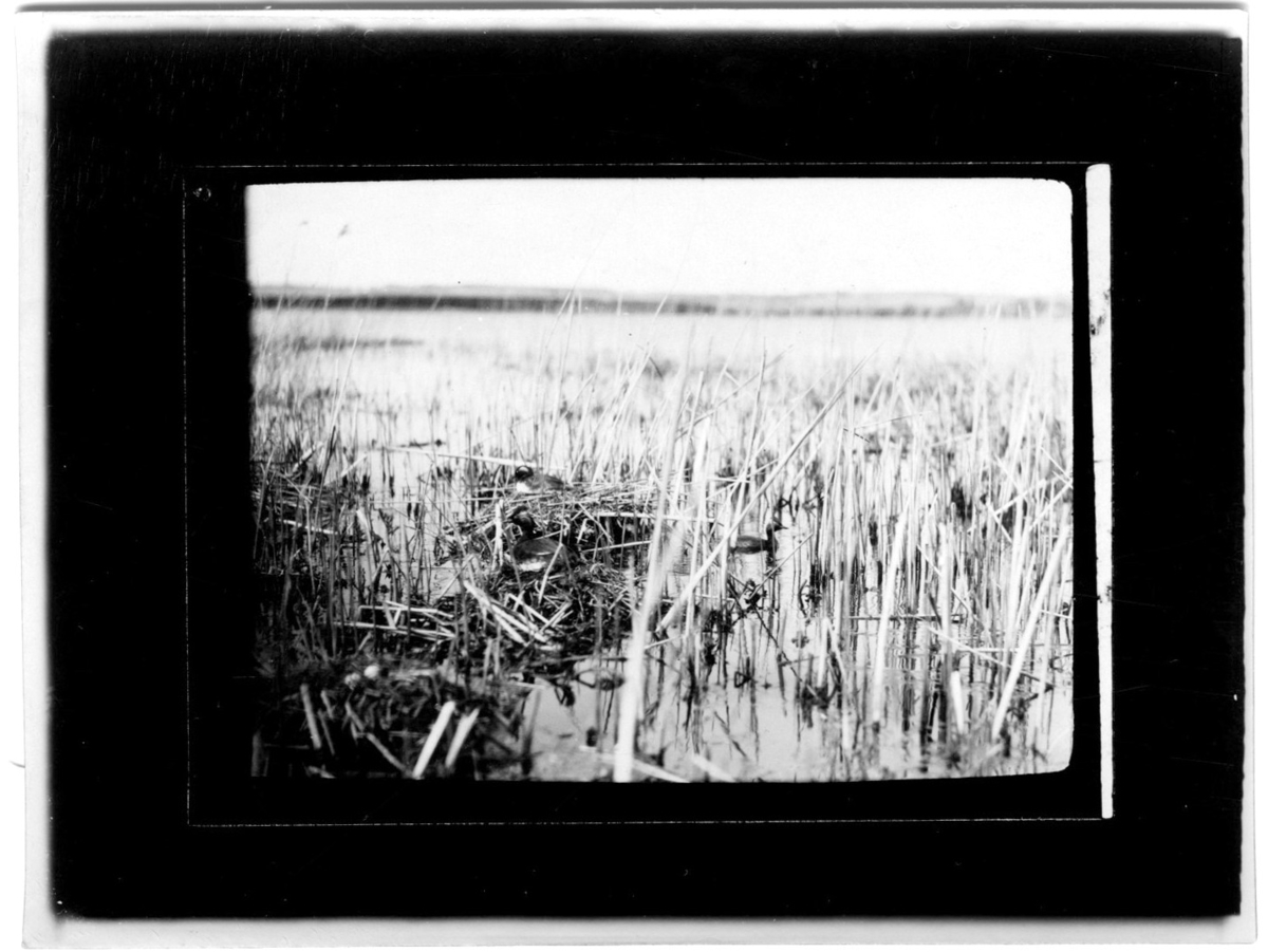'2 st svarthalsade doppingar i på sina bon i vassen. :: :: Ingår i serie med fotonr. 1661-1689.'