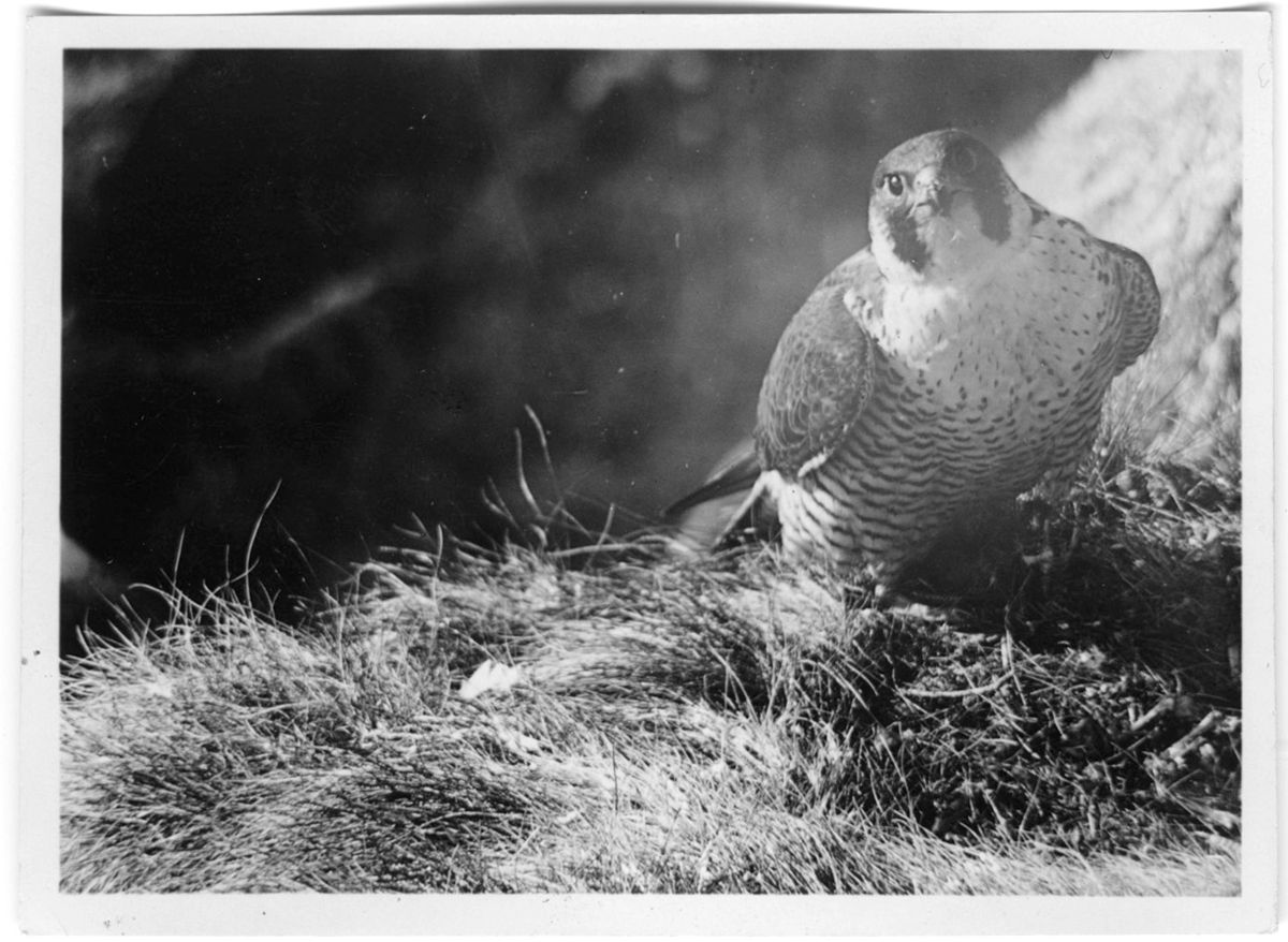 'Pilgrimsfalk, stående på marken intill bergvägg, sedd i närbild framifrån. :: :: Ingår i serie med fotonr. 1771-1837. Se även fotonr. 3151-3200.'
