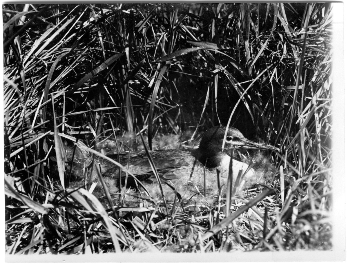 'Ruvande småskrakehona, närbild. Dunkrans kring boet, liggande i vassvegetation. :: :: Ingår i serie med fotonr. 1690-1708.'