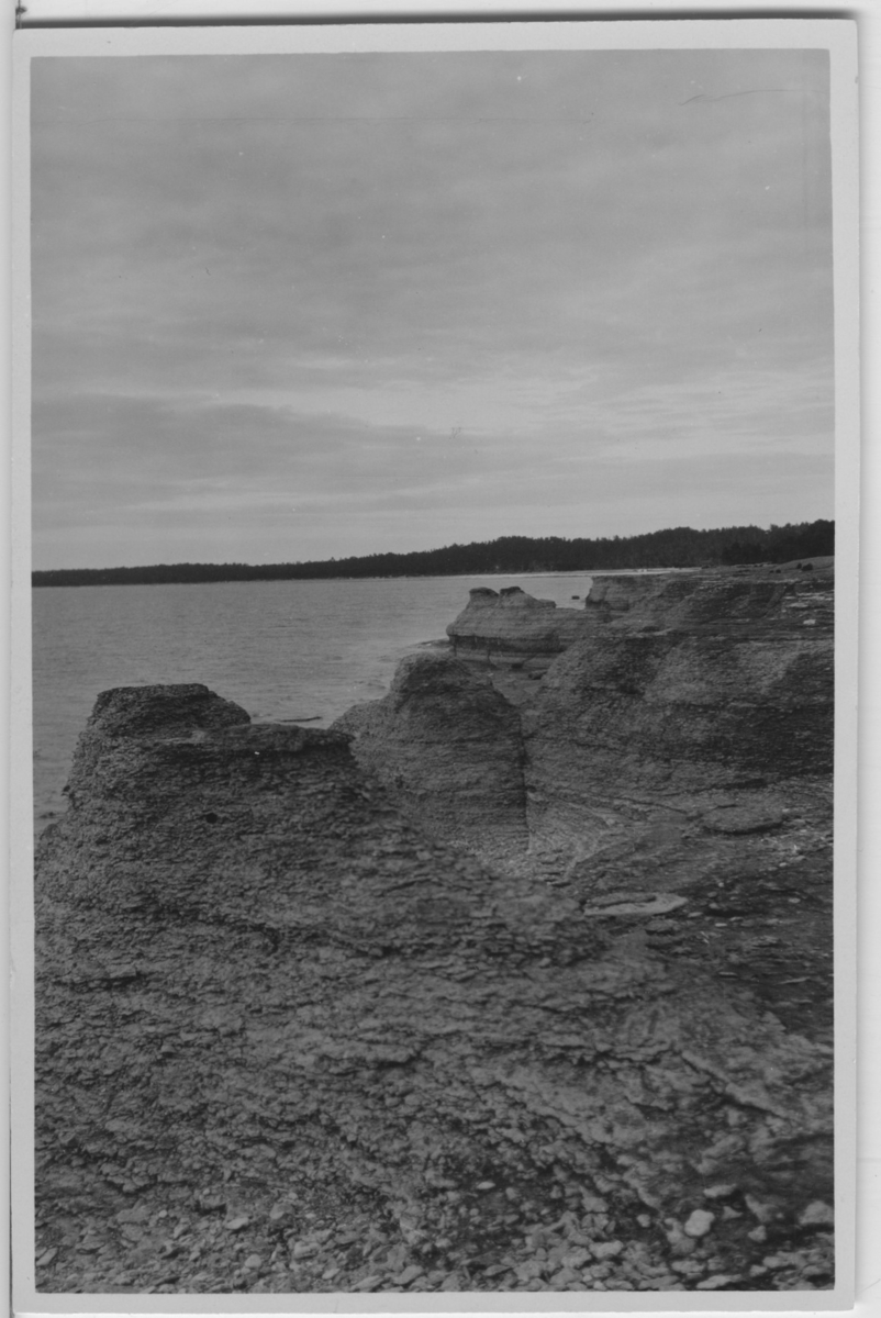 'Biologiska föreningens utfärd till Öland: :: :: Raukar vid Byrum, Ölands västkust. I bakgrunden havet och skog. :: :: Se även fotonr. 2607-2625, 2583-2606 samt 2883-2911 från samma utfärd.'