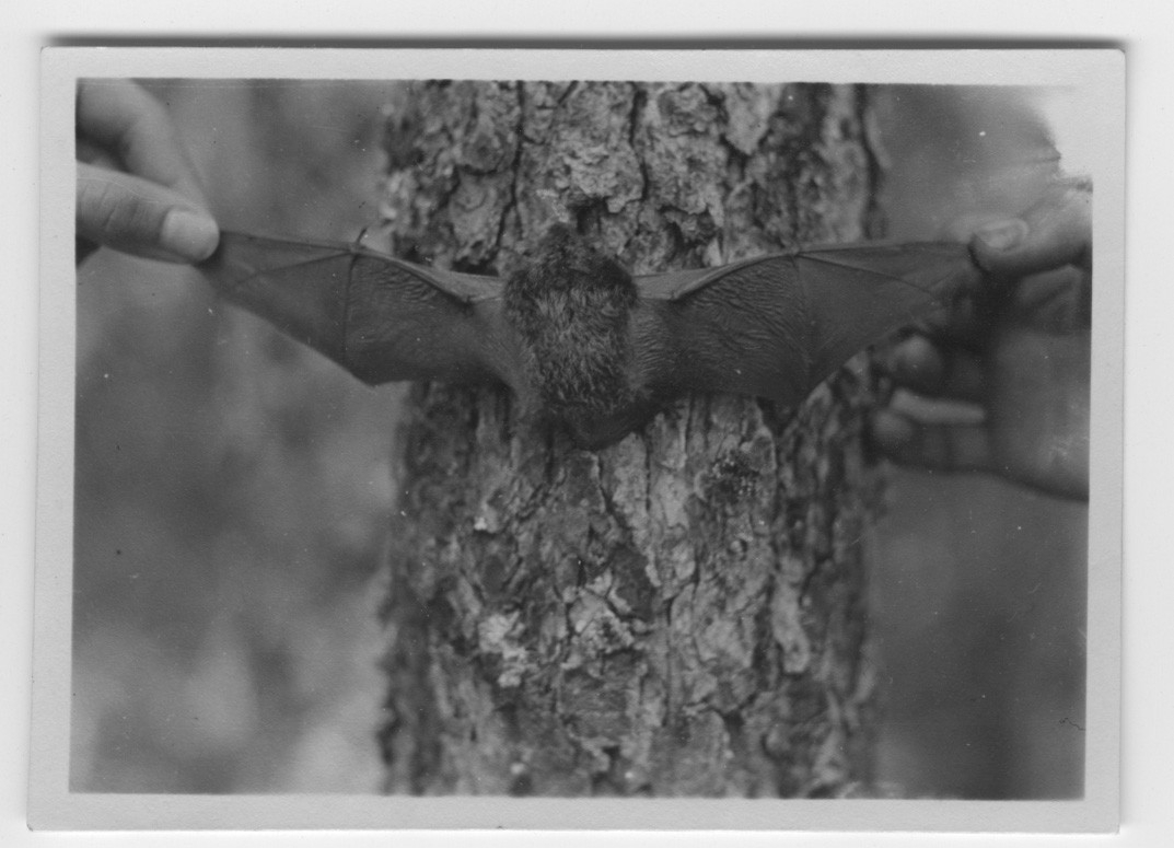 Fladdermus, med utspända vingar, hålls upp av 2 människohänder mot trädstam.