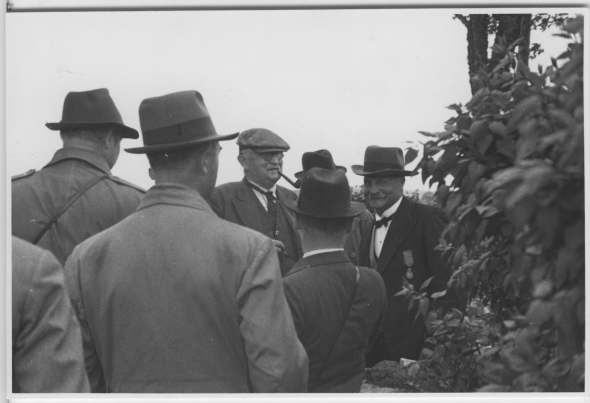 'Biologiska föreningens utfärd till Tåkern, Vadstena m.fl. platser: :: :: Ryggen av 4 män framför Leonard Axel Jägerskiöld (med pipa) och två andra män. De står vid runstenen ''Rökstenen'' söder om Tåkern. Se även fotonr. 3619. :: :: Se fotonr. 3588-3634 samt 3661-3677.'