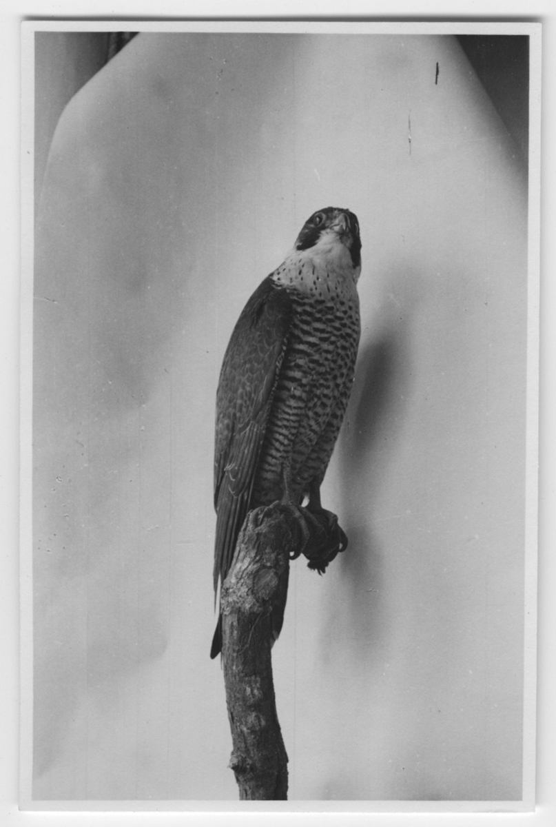 Titel: 'Pilgrimsfalk, ringmärkt, monterad på gren. :: :: Ringmärkt 23137D Göteborg, Sweden vid Susegården, Kvibille socken, Halland 1934-06-14, skjuten 1935-10-10 vid Braadegaard, Braade, Nykjöbing, Själland, Danmark. :: :: Se fotonr. 3523-3526.'