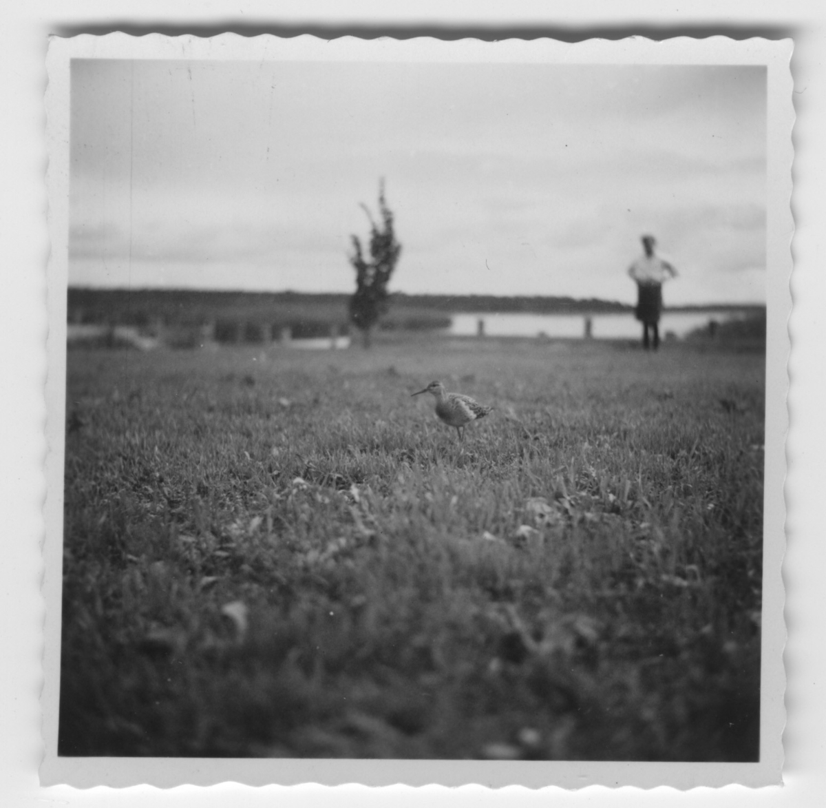 'Brushöna på äng, sedd från sidan. 1 person i bakgrunden. I fonden vattensamling. :: :: Igår i serie med fotonr. 3358-3359.'