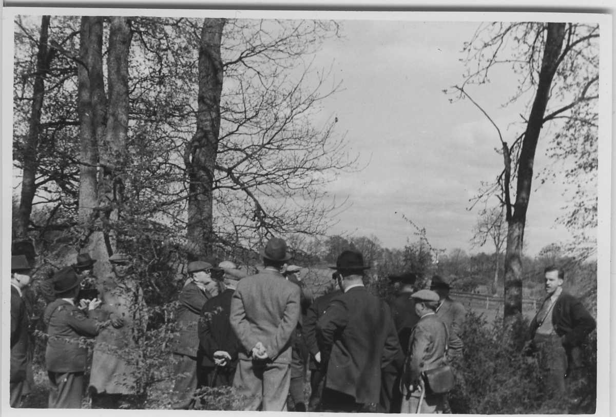 'Från Biologiska Föreningens utfärd till Ivö m. fl. platser i NÖ Skåne: :: :: Gruppen, ca 20 män, söker blåkråka. Leonard Axel Jägerskiöld framför andra trädet från höger, sedd i profil. :: :: Se fotonr. 4119:1-11 och 4120:1-10 från samma utfärd. Fotonr.'