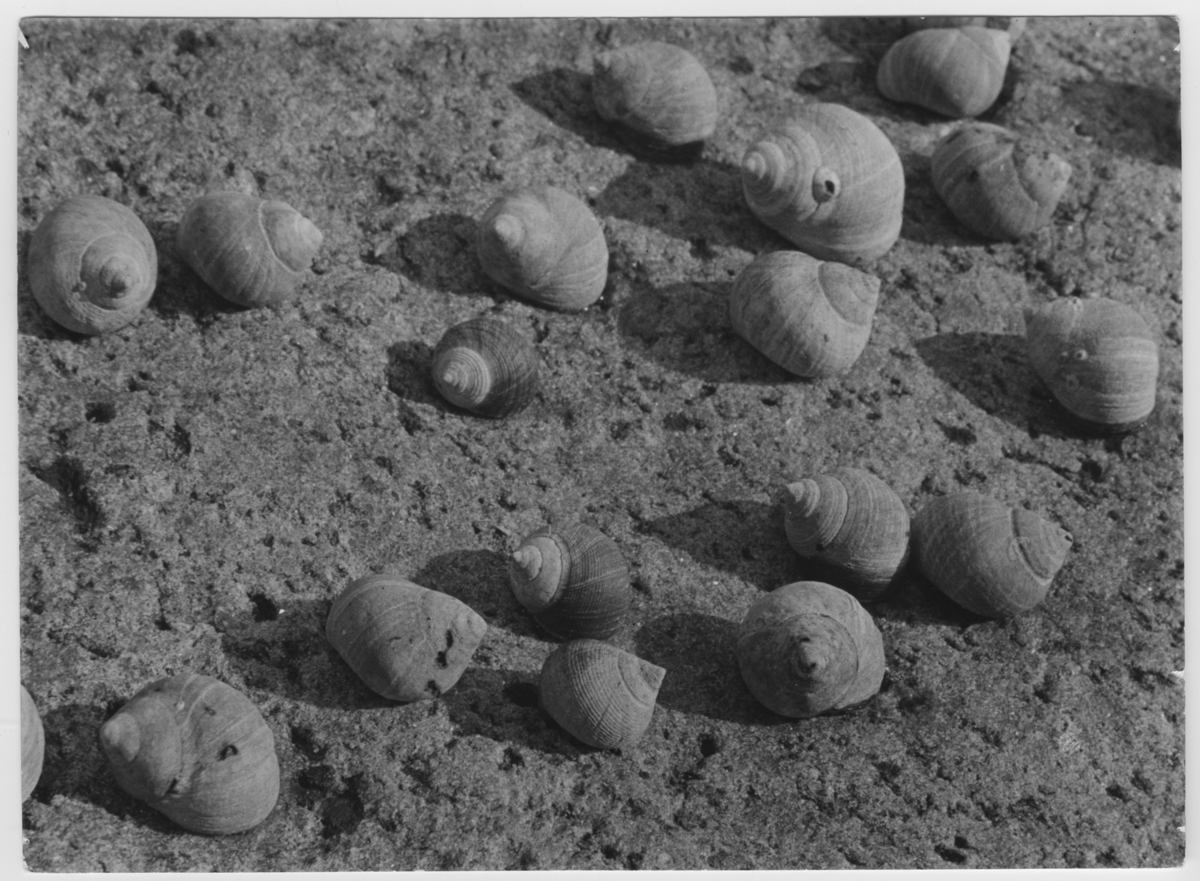 'Strandsnäckor, 17 st på sten i närbild. Sedda från ovansidan. :: :: Ingår i serie med fotonr. 4060-4064.'