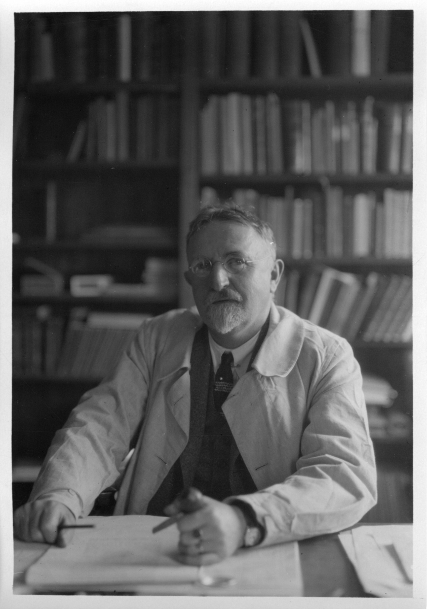 Professor Leonard Axel Jägerskiöld vid arbetsbordet. Framför sig papper och pennor i händerna. I bakgrunden bokhylla full med böcker.