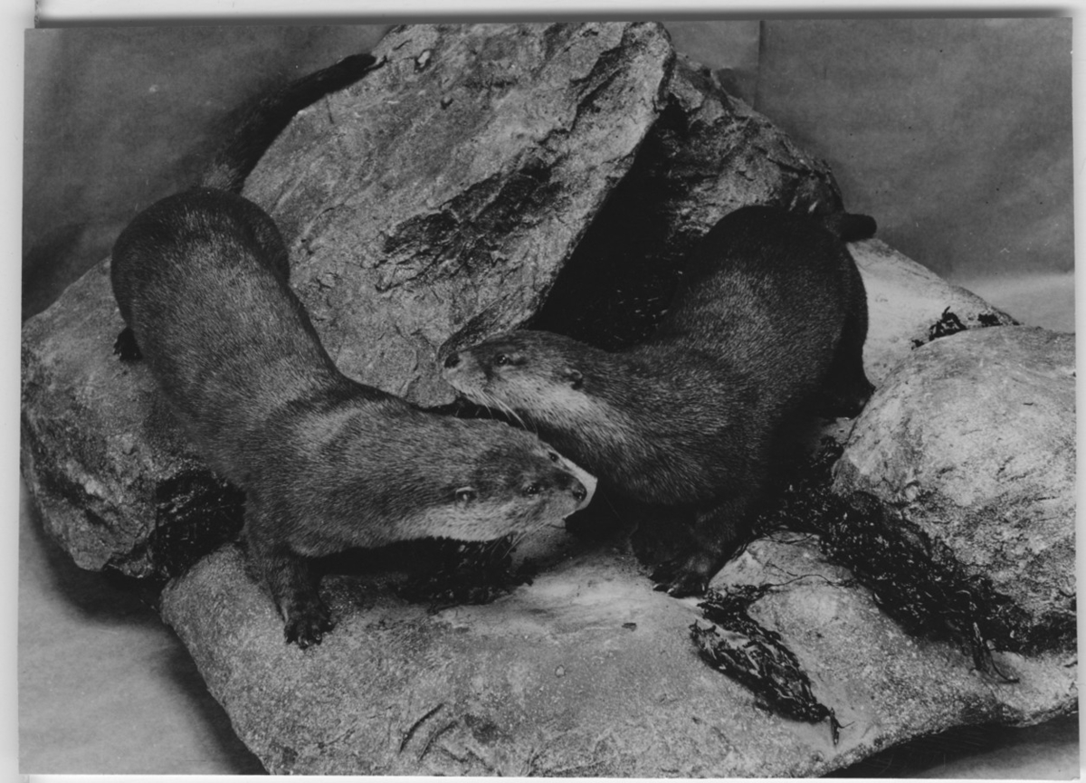 '2 uttrar, till höger hane och till vänster hona. Monterad utterdiorama av konservator David Sjölander. :: :: hona: 25-4343 Ma.su.621. Fynddatum: 1924-07-27, Västergötland. :: hane: 43-8023 Ma su. 1017. Fynddatum: 1942-04-11. Bohuslän :: :: Fynddatum: 1942-04-11. :: :: Bilden med i Göteborgs Naturhistoriska Museums Årstryck 1944 s. 10. :: :: Montaget finns utställt i monterskåp nr. 5 i däggdjurssalen på Göteborgs Naturhistoriska Museum (2008-02-05).'