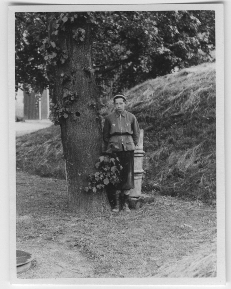 Gröngölingsbo och hål i lind. Pojke står bredvid.