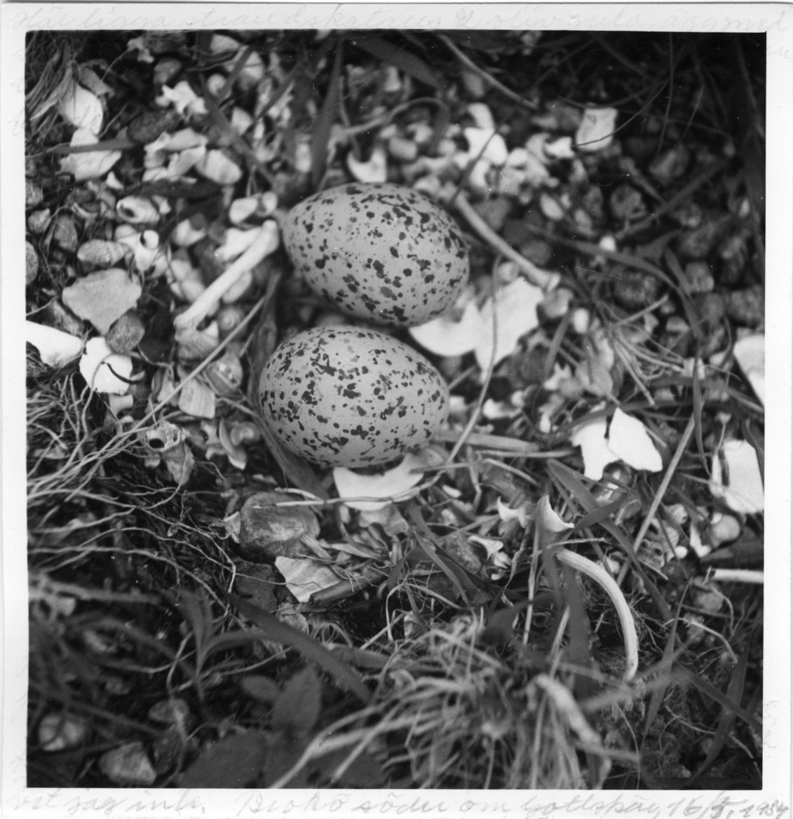 'Enligt anteckning på fotografiets baksida: :: ''Här ligger strandskatans 2 olivgula ägg med stora svarta och grå ytfläckar. Honan har dekorerat boet med snäckskal och på bilden syns även ben-knotor. :: Bilden togs på 33 cm avstånd. Boet låg på Västra stranden. Den 20 maj 1945 fann jag samma fågelbo. Om det är far och mor eller dotter och son, som häckar det vet jag inte.'' :: :: Ingår i en serie med fotonr. 4512:1-57 med diverse foton av fågelbon med ägg och ungar. Varje fotografi har utförliga anteckningar på sin baksida, kopierade från framsidan, spår av de på framsidan är fortfarande synliga.'